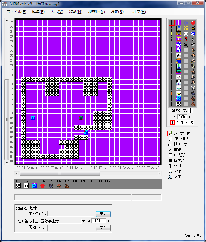 方眼紙マッピングなるソフトを使ってやっているんですが、これがカスタマイズ簡単にできるので、地図のピースをスタクルで使われているものに変えてつけてます。